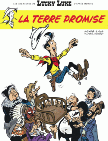 Enfin le grand retour de Lucky Luke ! Dans La Terre Promise, Jul et Achdé ont assigné une mission rocambolesque à l'éternel justicier. Lucky Luke doit escorter toute une famille de juifs d'Europe de l'Est à peine débarqués du bateau à Saint Louis jusqu'aux confins de l'Ouest sauvage ! Jusqu'alors, l'homme qui tire plus vite que son ombre avait déjà côtoyé de sacrés originaux. Un prince russe dans Le Grand Duc, un aristocrate anglais dans Le Pied-Tendre, un psychanalyste viennois dans La Guérison des Dalton... Mais lorsque son copain Jack-la-Poisse le supplie de s'occuper de ses parents (à qui il n'a pas osé avouer qu'il était cow-boy et qui le croient avocat à New-York), Lucky Luke n'écoute que son coeur. Avec un grand-père religieux obsédé du shabbat, une mamma décidée à gaver Lucky Luke de carpe farcie, une jeune fille prude qui cherche le mari idéal (avocat ou médecin, mais bon, cow-boy ça va aussi), et un gamin turbulent plus intéressé par le Far-West que par sa Bar Mitsvah, le voyage promet d'être long. Desperados, joueurs de poker, attaques d'indiens féroces (la tribu des "Pieds Noirs" a mauvaise réputation), tout l'univers de Lucky Luke va être confronté à ce choc des cultures. Mais à la fin du voyage, c'est autant notre cow-boy solitaire que sa nouvelle famille d'adoption qui auront appris à surmonter les épreuves et les préjugés.
